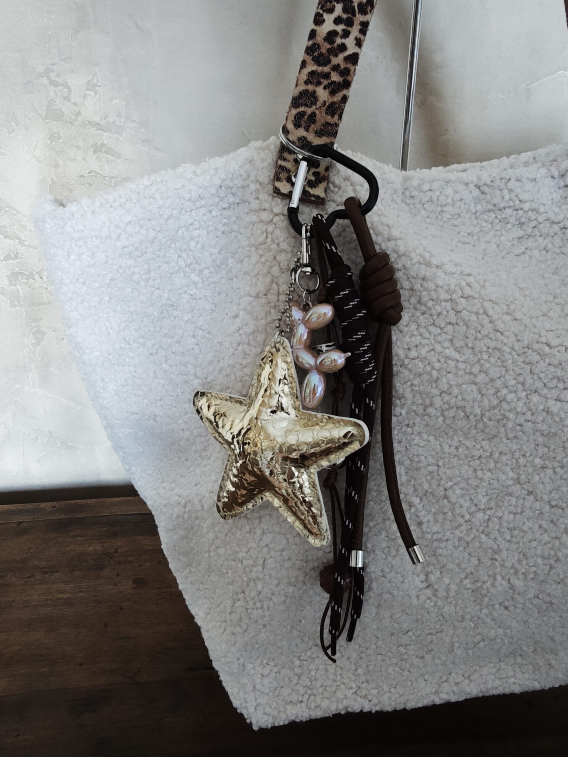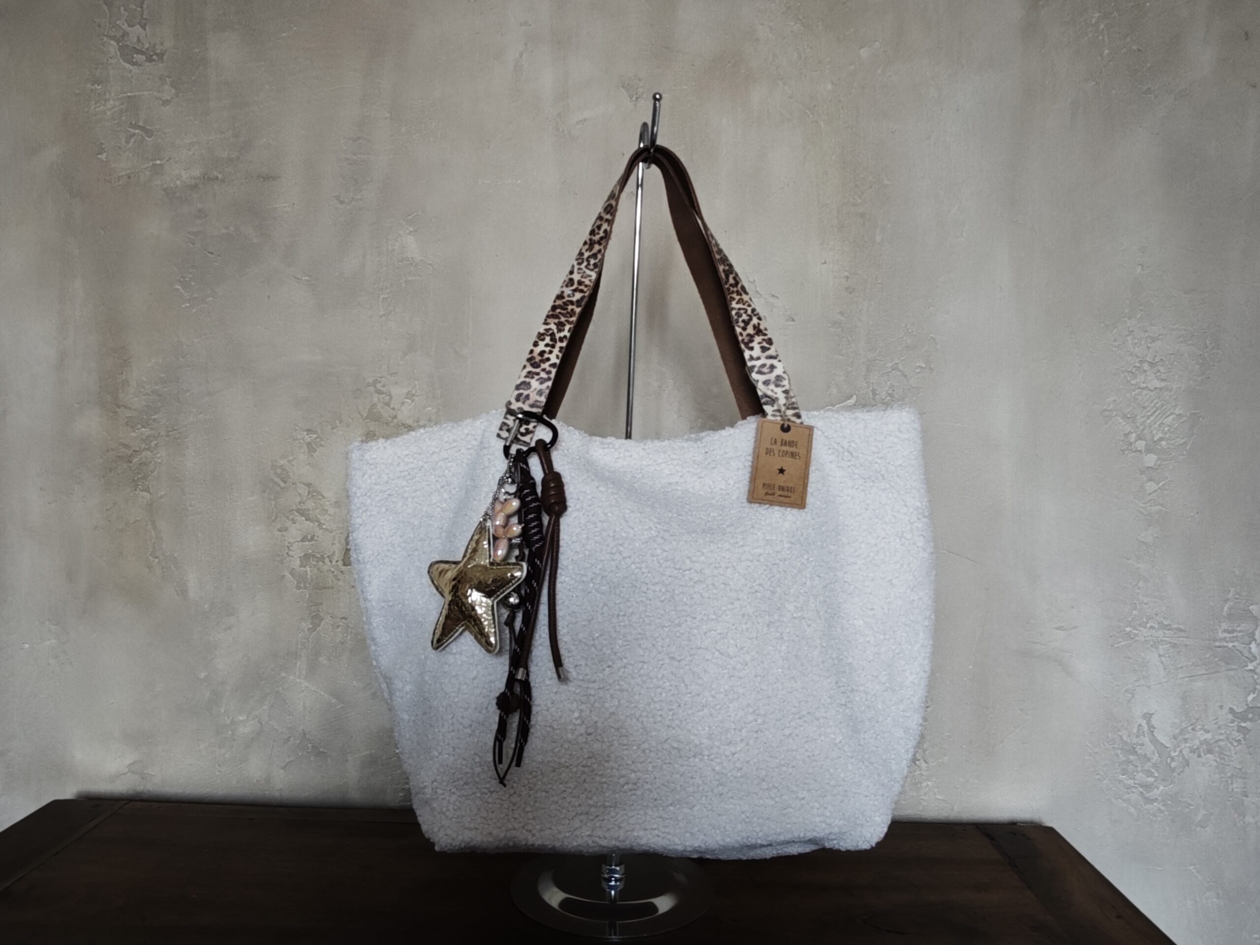 doublé avec poche intérieure et anses en cuir léopard posées avec des rivets ton alu .