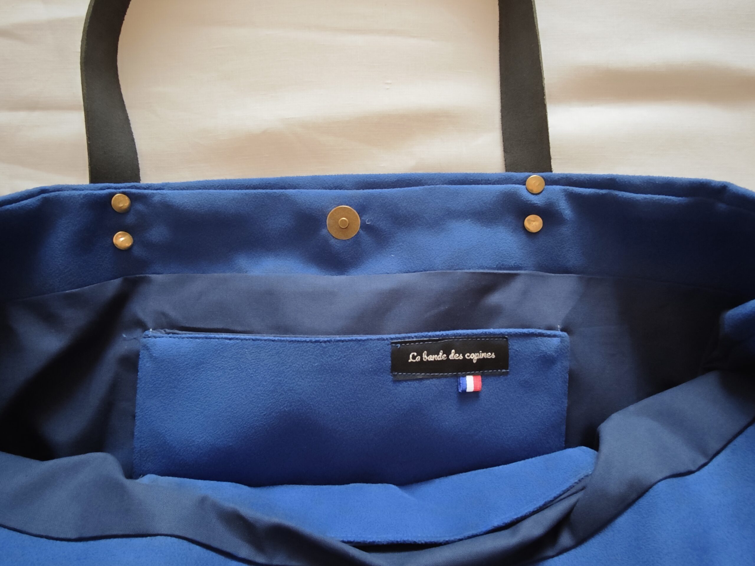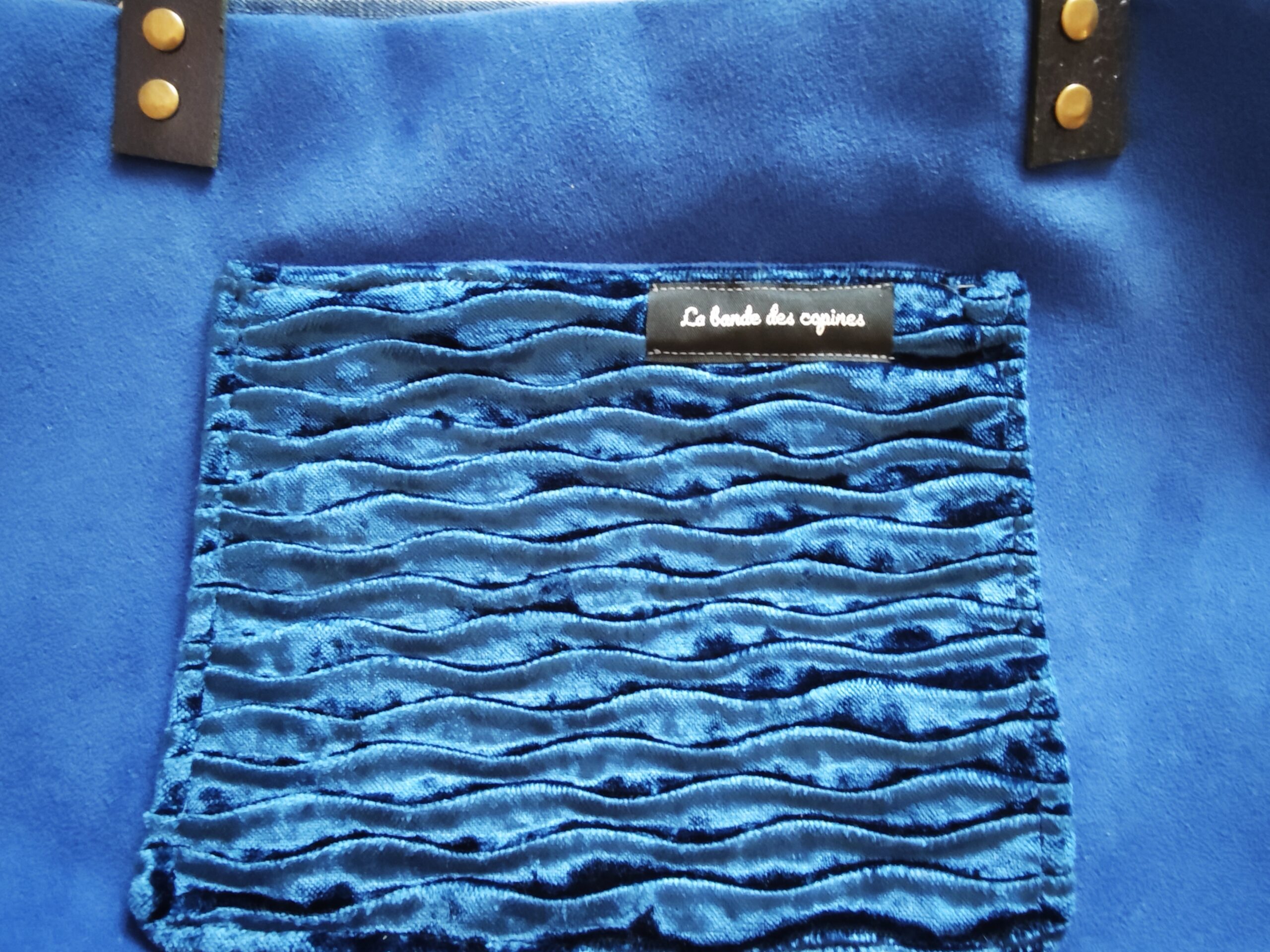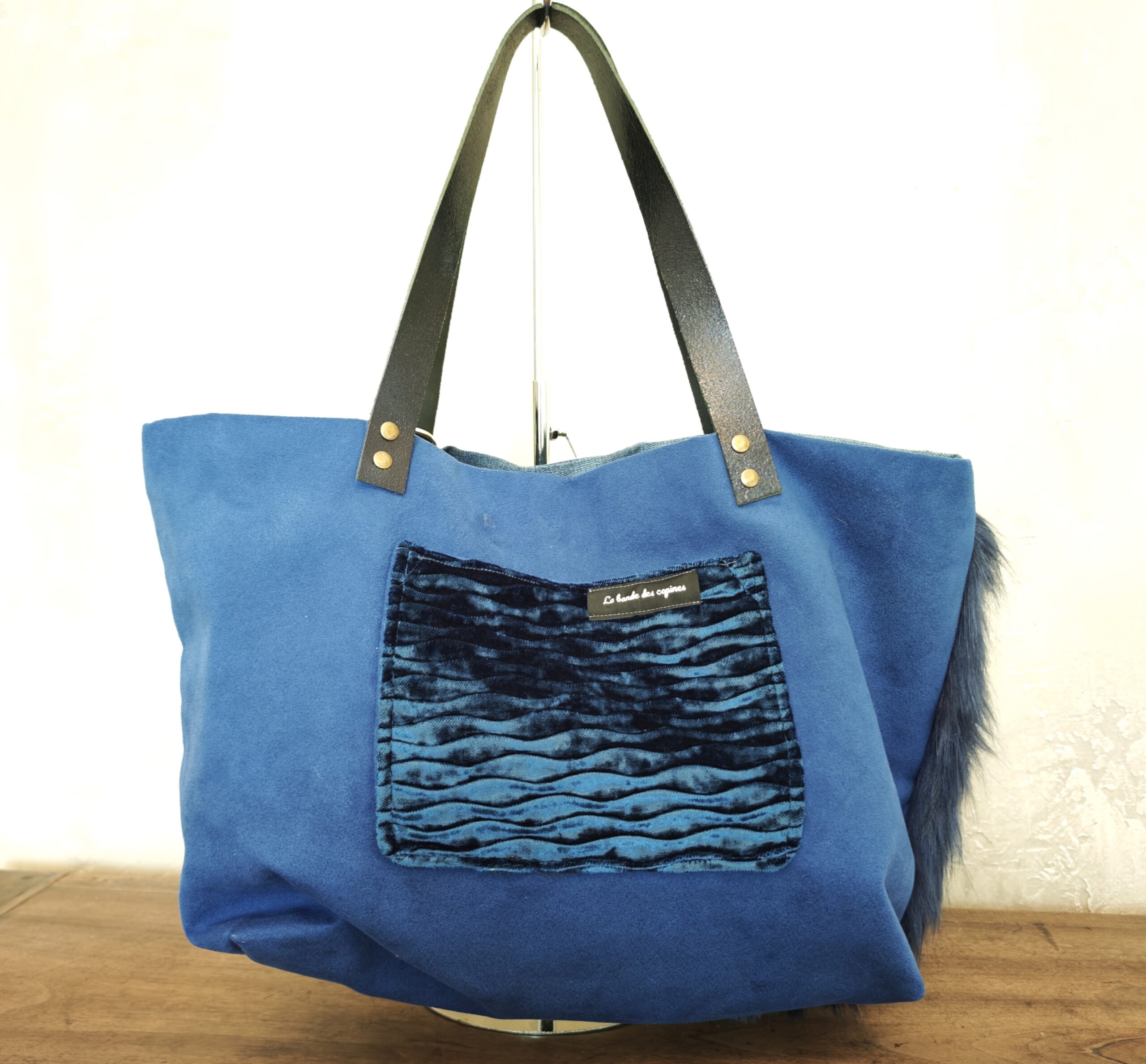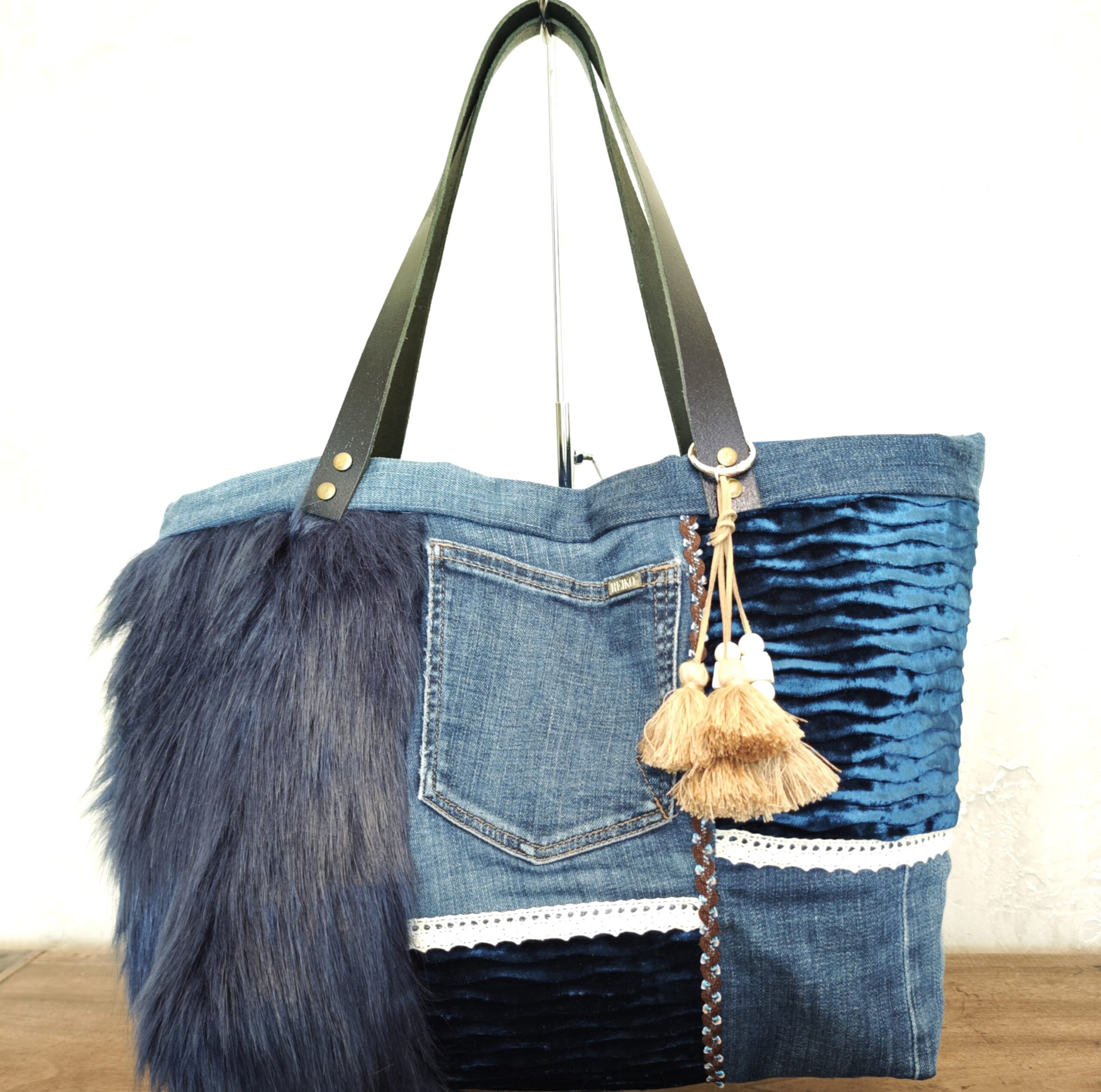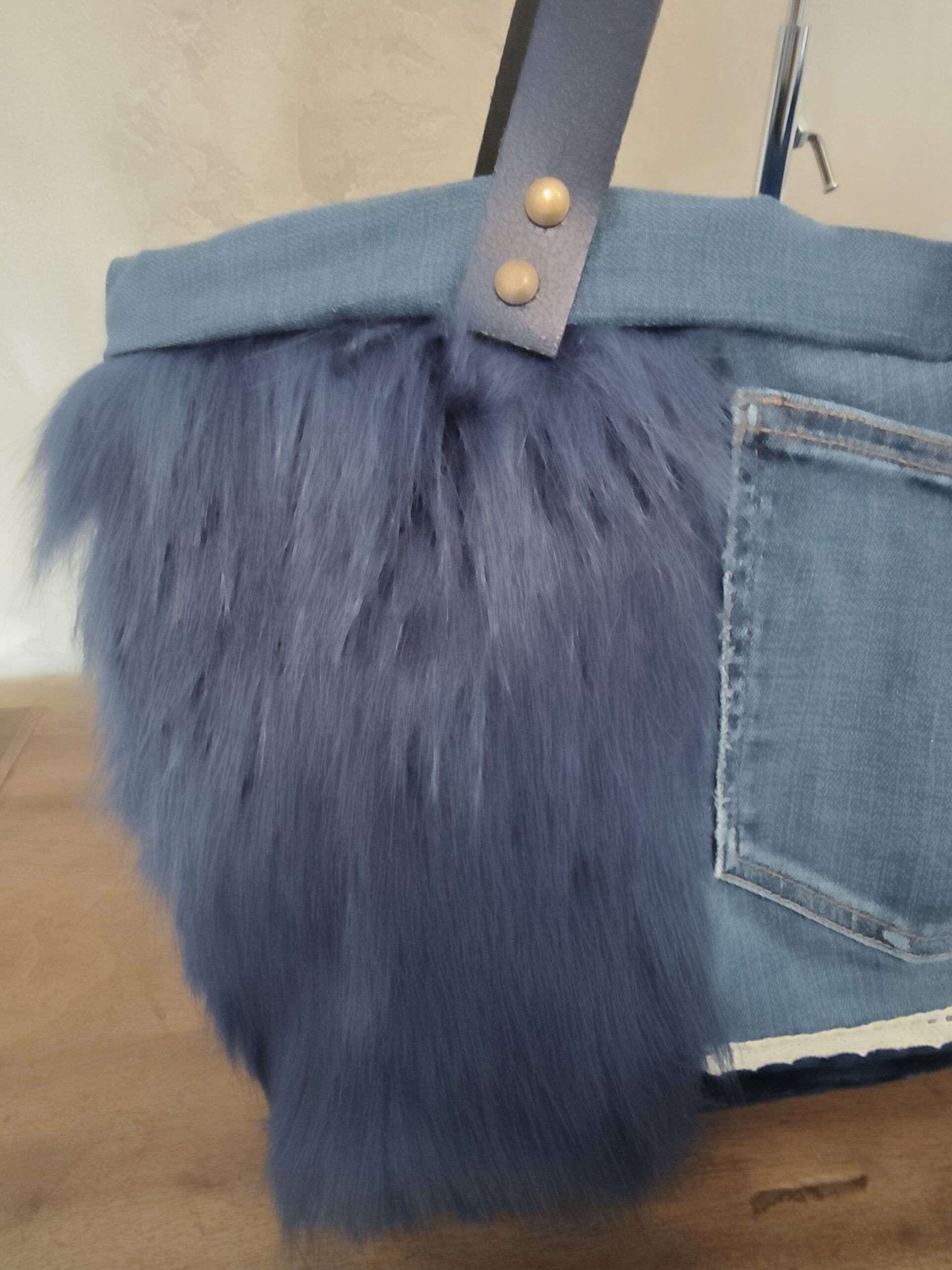 Cabas réalisé avec du jean de récupération ,de la fausse fourrure bleue et du tissus précieux .
